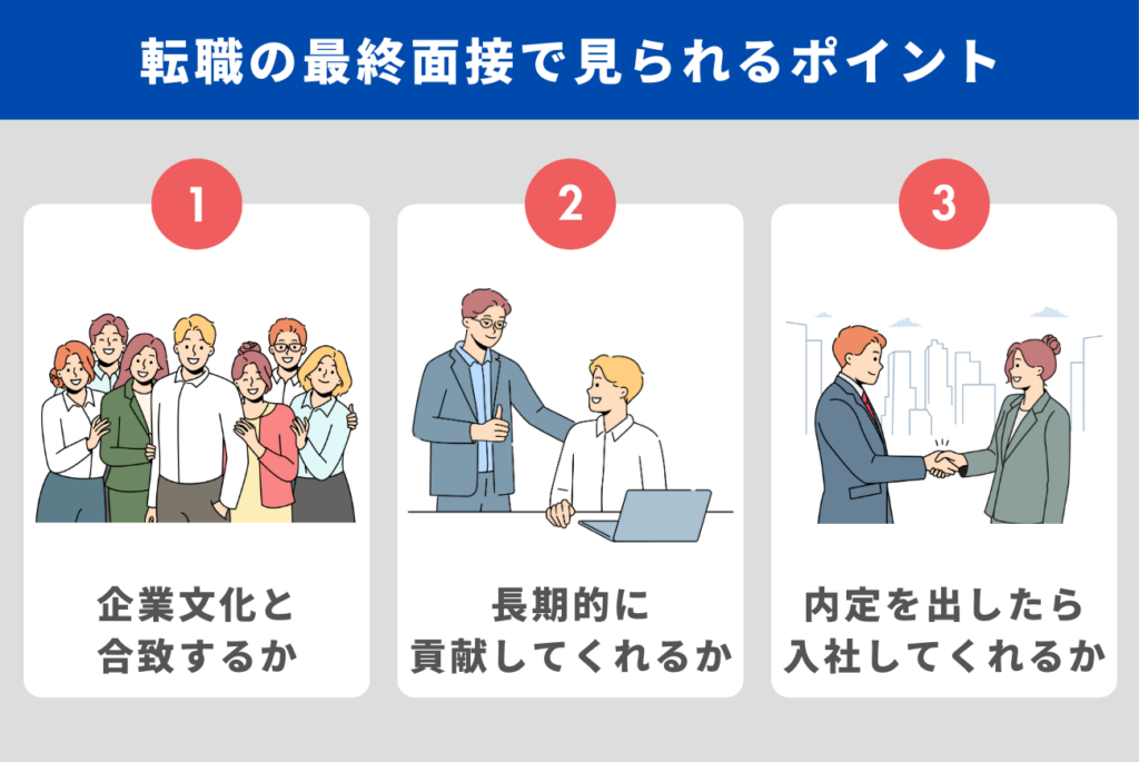 企業は採用に膨大なコストをかけていることから、入社後すぐに辞めてしまう人材は避けたいと考えています。そのため、最終面接では「この人は長く働いてくれるか」「将来的にどのような活躍が期待できるか」といった観点で評価されます。