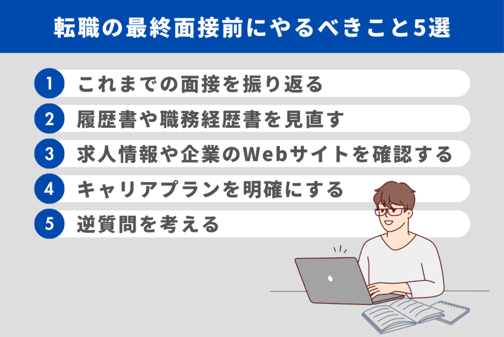 これまでの面接でどのような質問があったか、面接官がどのポイントに関心を示していたかを振り返って整理しておくと、最終面接でも一貫性のある受け答えがしやすくなります。さらに、前回までの面接で伝えきれなかった自身の強みや、十分に答えられなかった質問がある場合には、それらを補足できるよう準備しておくことも大切です。