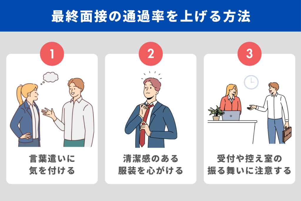 最終面接の通過率を上げたい方は、以下のポイントを意識してみてください。
