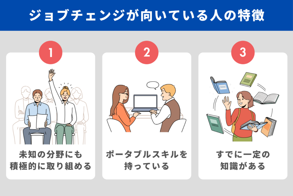 ジョブチェンジでは即戦力としてのスキルよりも、学習意欲や順応力を評価される傾向があるため、失敗を恐れずに行動できる人ほど新しい職場に早く馴染みやすいといえます。