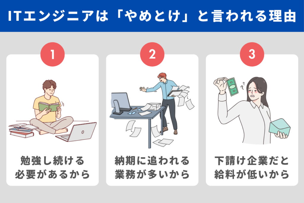 ITエンジニアは魅力的な職種ですが、次のような理由から「やめとけ」と言われることもあります。
